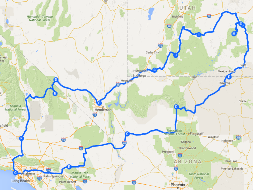 C'est donc reparti pour un road-trip de 3 semaines à travers la Californie, l'Arizona, l'Utah et le Nevada... Avant d'en dire un plus, voici la carte avec le parcours que nous avons prévu de faire.