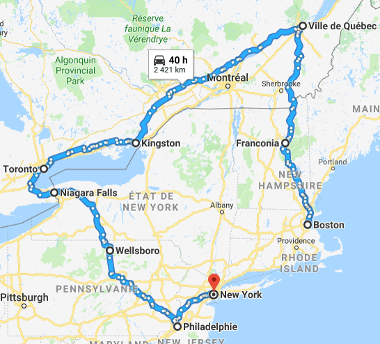 Dans un premier temps, avant plus de détail, voici la carte de notre road-trip 2018 entre les USA et le Canada.
