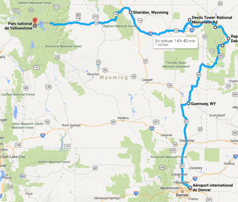 Nous nous envolerons de Washington DC vers Denver. Après un peu plus de 3 heures de vol nous prendrons une voiture et en route vers Guernsey qui se trouve a mi-chemin vers notre prochaine étape : Rapid City dans le Dakota du Sud.