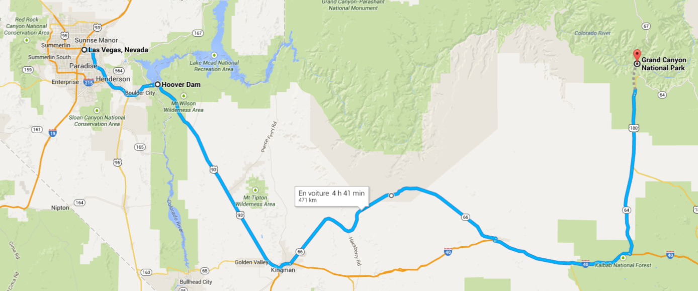 Nous partons de Las Vegas en direction du barrage Hoover. Après un détour sur la mythique Route 66, nous reprenons l'interstate et nous dirigerons vers le Grand Canyon. Nous y verrons le coucher du soleil. Cela promet d'être splendide !