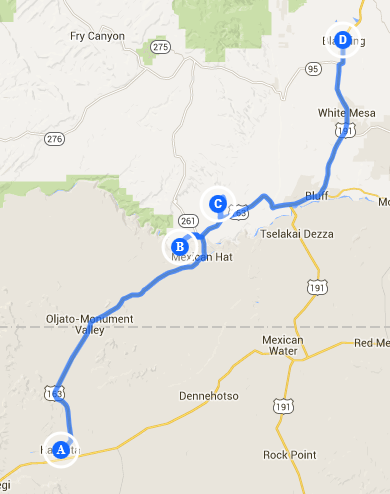 Après avoir profité de vallée dans son ensemble, nous remontons en voiture. La route étant en cul de sac, nous reprenons forcément la même route afin de retrouver la US163 et poursuivons vers notre étape finale du jour Blanding. Peut être l'occasion de se faire un steak-house relax.