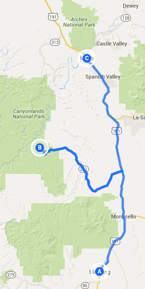 Nous commencerons pas visiter la partie sud de Canyonlands car elle est sur la route, via un petit détour de quelques kilomètres. A savoir qu'il n'y a pas d'accès entre les parties nord et sud du parc.